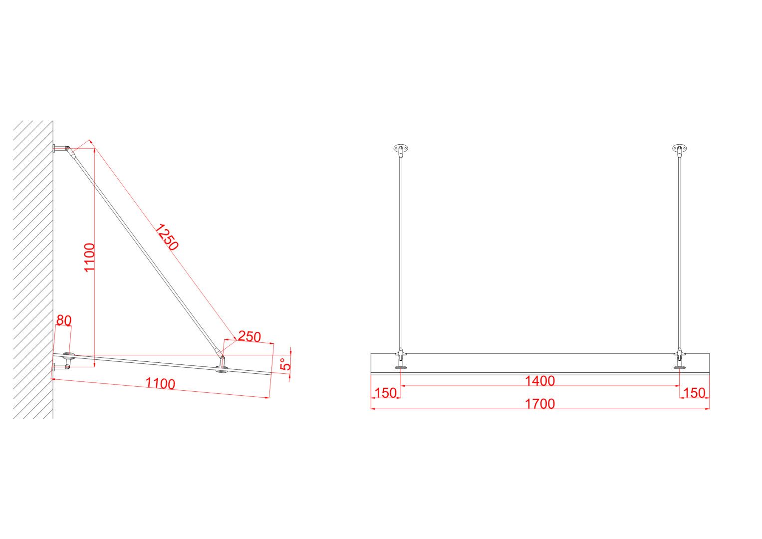 W skład zestawu wchodzą okucia daszku mocowane do ściany - 2 komplety oraz szkło bezbarwne laminowane VSG i hartowane ESG o grubości 12,76 mm oraz wymiarach 170x110 cm - 1 sztuka. Warto zaznaczyć, że akcesoria montażowe nie są dołączone do zestawu, jednak są one łatwo dostępne w naszej ofercie jako produkty powiązane.