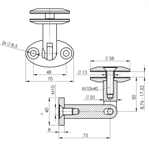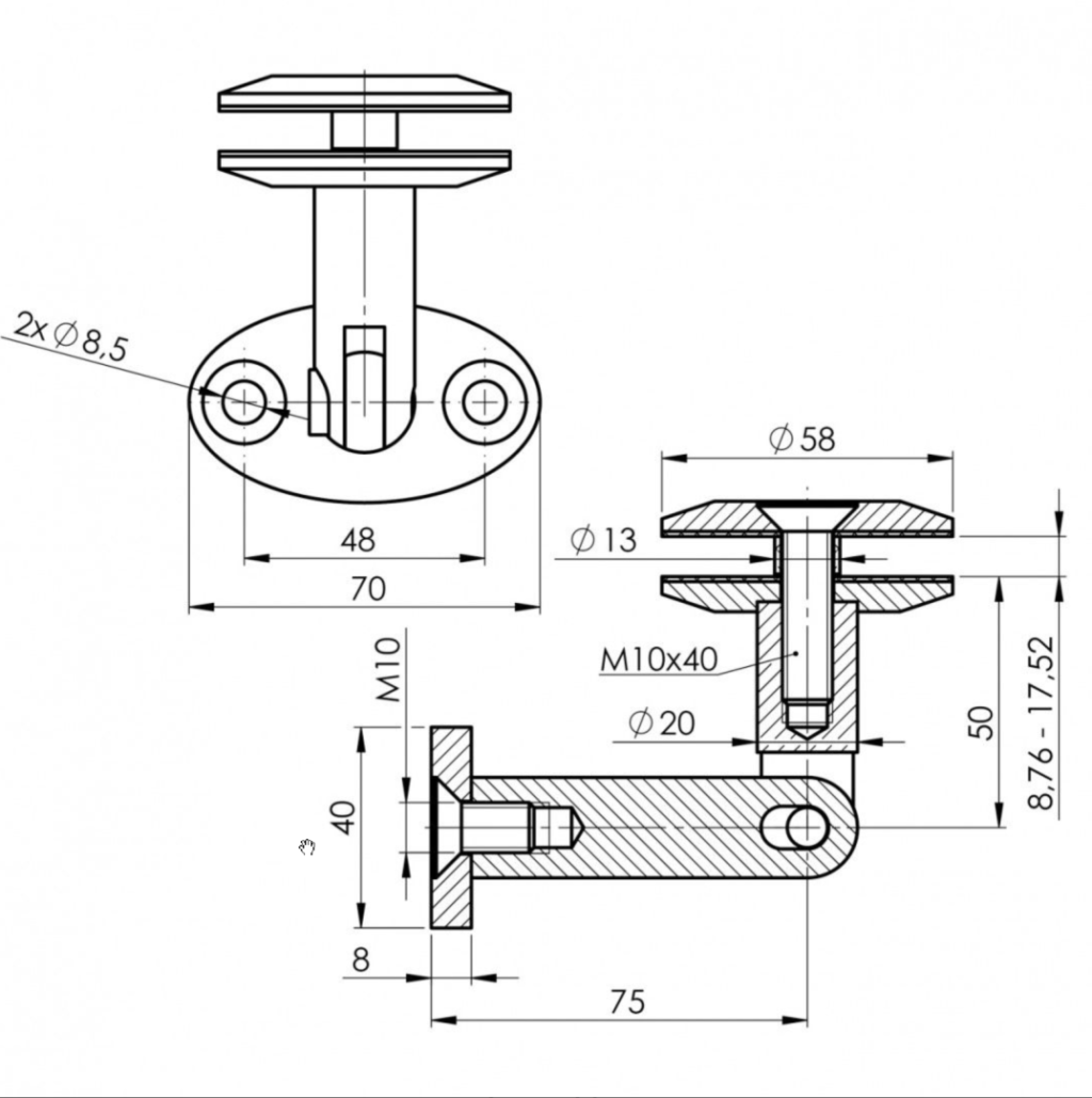 Solidny element konstrukcyjny wyposażony w uchwyt zaciskowy do szkła, umożliwiający pewne i bezpieczne mocowanie tafli szklanej. Konstrukcja mocowania jest regulowana, co pozwala na precyzyjną regulację kąta nachylenia wypełnienia. Wykonane z wysokiej jakości stali nierdzewnej, mocowanie łączy trwałość, funkcjonalność i estetykę, doskonale komponując się z nowoczesną architekturą.